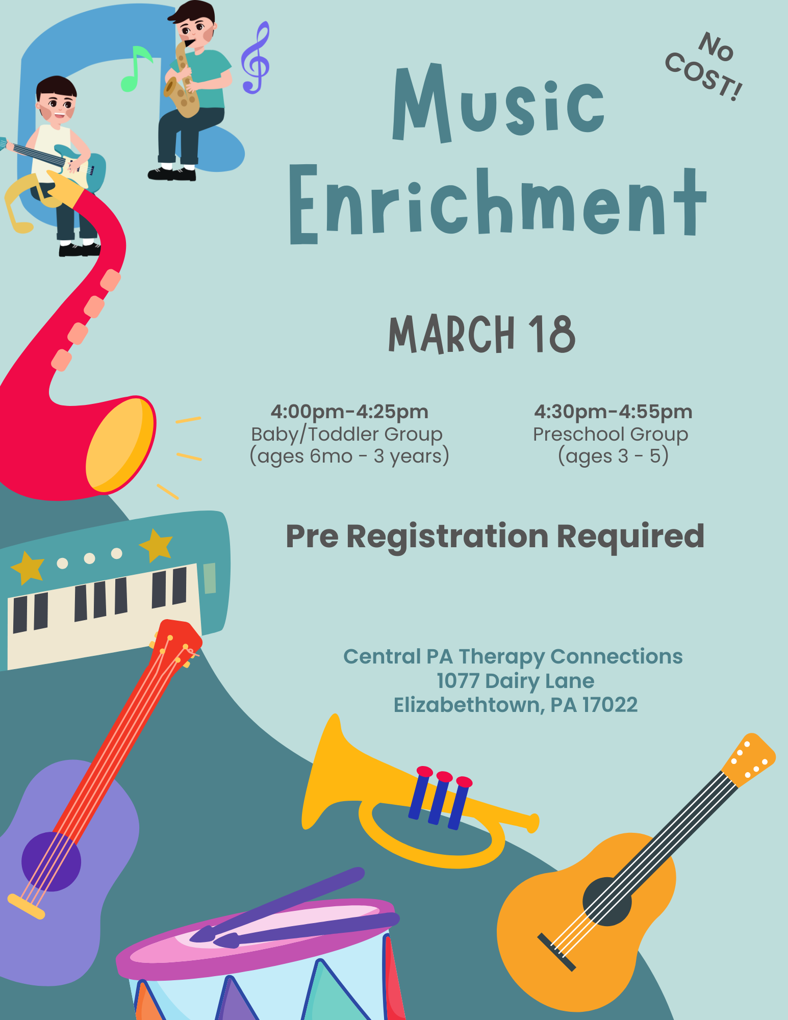 The Music Enrichment Groups are led by Lauren, a board-certified music therapist from Breakthrough Music Therapy (https://breakthroughmusictherapy.com/). The groups are designed to promote healthy developmental skills by helping children bond with caregivers, take turns with other children, find ways to communicate, handle big feelings, listen and follow directions, and feel calm in their body, all through using music and play. This session incorporates singing, instruments, play, sign language, movement, dramatic storytelling, and more. Inclusive for children with developmental needs, with or without a diagnosis.